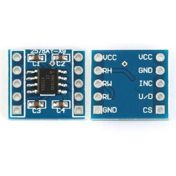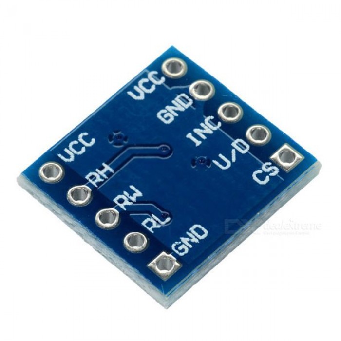 The X9C104 digital potentiometer module helps you simulate the mechanical control of a potentiometer. The integrated circuit contains 99 series-related resistors. With a microcontroller, you can control the module and select the place where the center pin of the "potentiometer" is connected, anywhere in the 100 points available (at the ends of the group or between the resistors).
